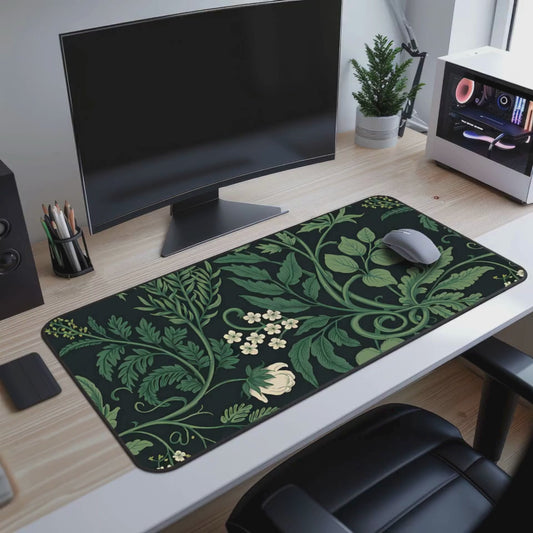 Art Nouveau Desk Mat, Vintage Floral Sage Green Plants Design, Large Extended Mousepad, Botanical Dark Green Desk Mat, Home Office Decor