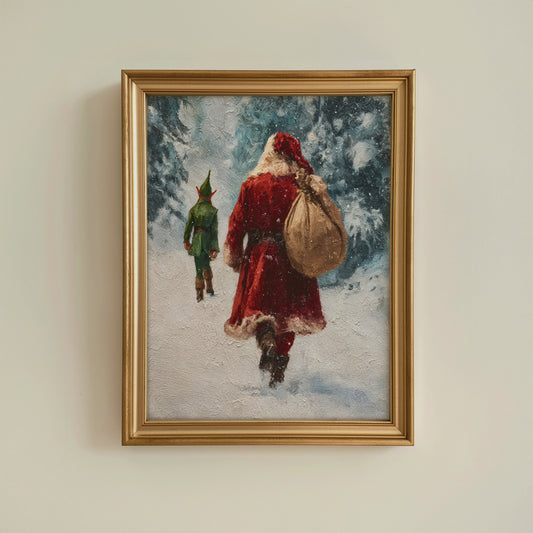 Vintage Santa Claus and Elf Walking Through Winter Forest Poster, Cozy Christmas Holiday Print, Home Decor Wall Art, Unframed
