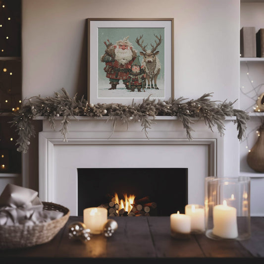 Nordic Christmas Magic Fine Art Poster, Santa and Elf with Reindeer Vintage Print, Whimsical Holiday Wall Art, Cozy Winter Forest Decor, Unframed