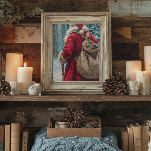 Vintage Santa Claus and Elf Poster, Elf Riding in Santas Bag Print, Cozy Christmas Holiday Poster, Home Decor Wall Art, Unframed