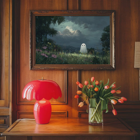 Haunted Ghost in Meadow Poster, Spooky Eerie Ghost Moonlit Wildflower Field Wall Art Print