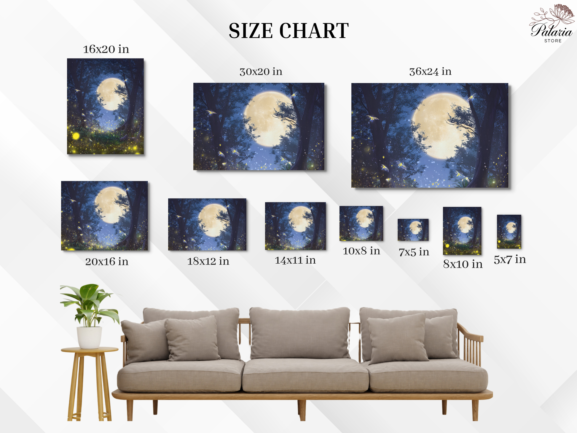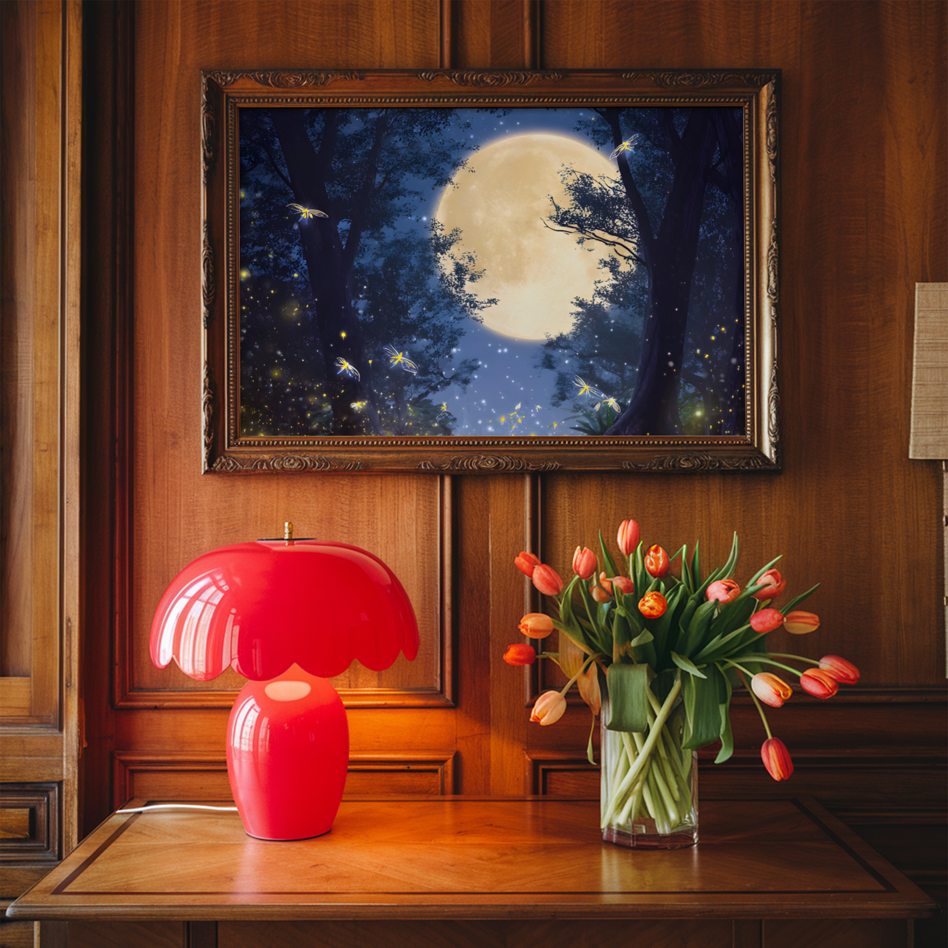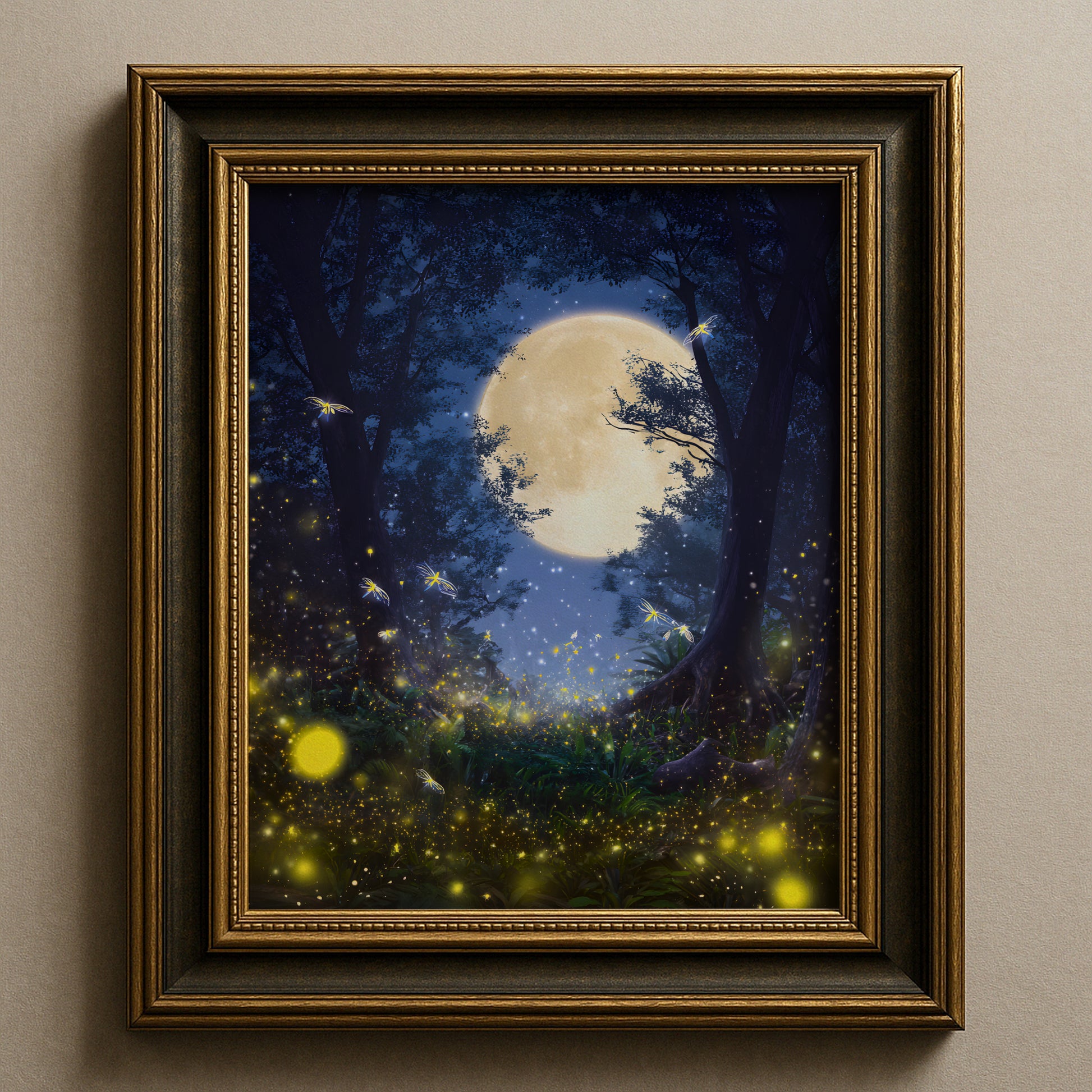 Glowing Fireflies in the Moonlit Forest Poster, Ethereal Moonlight Forest Print, Dreamlike Forest Night Wall Art, Unframed