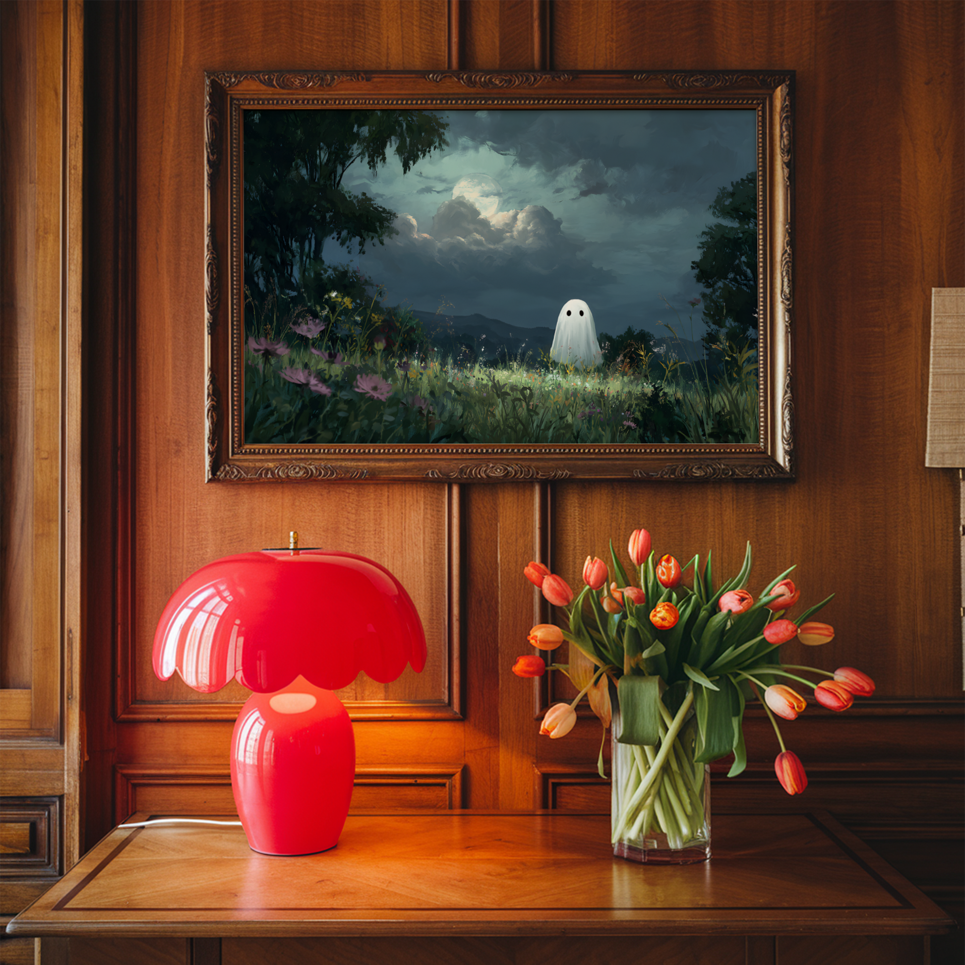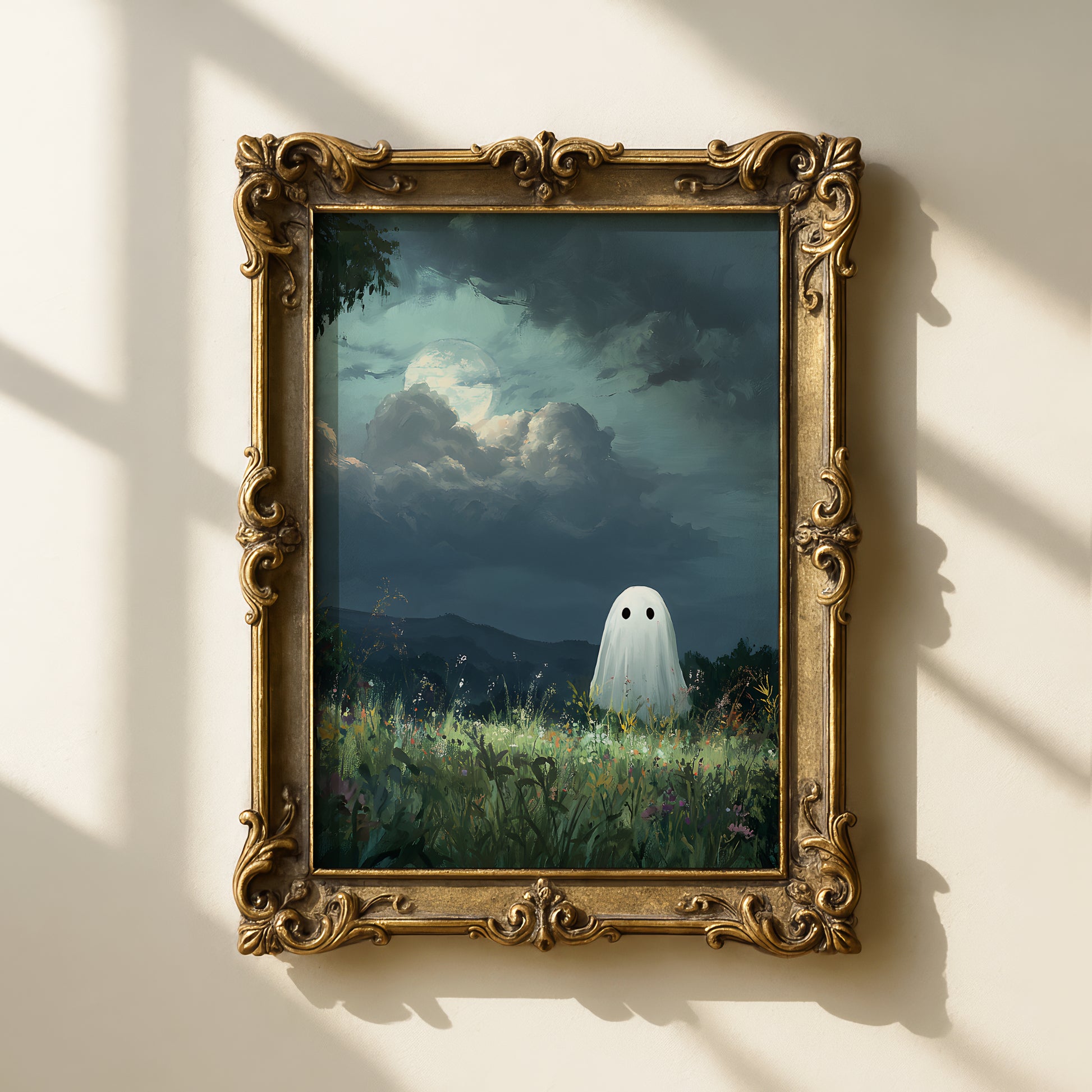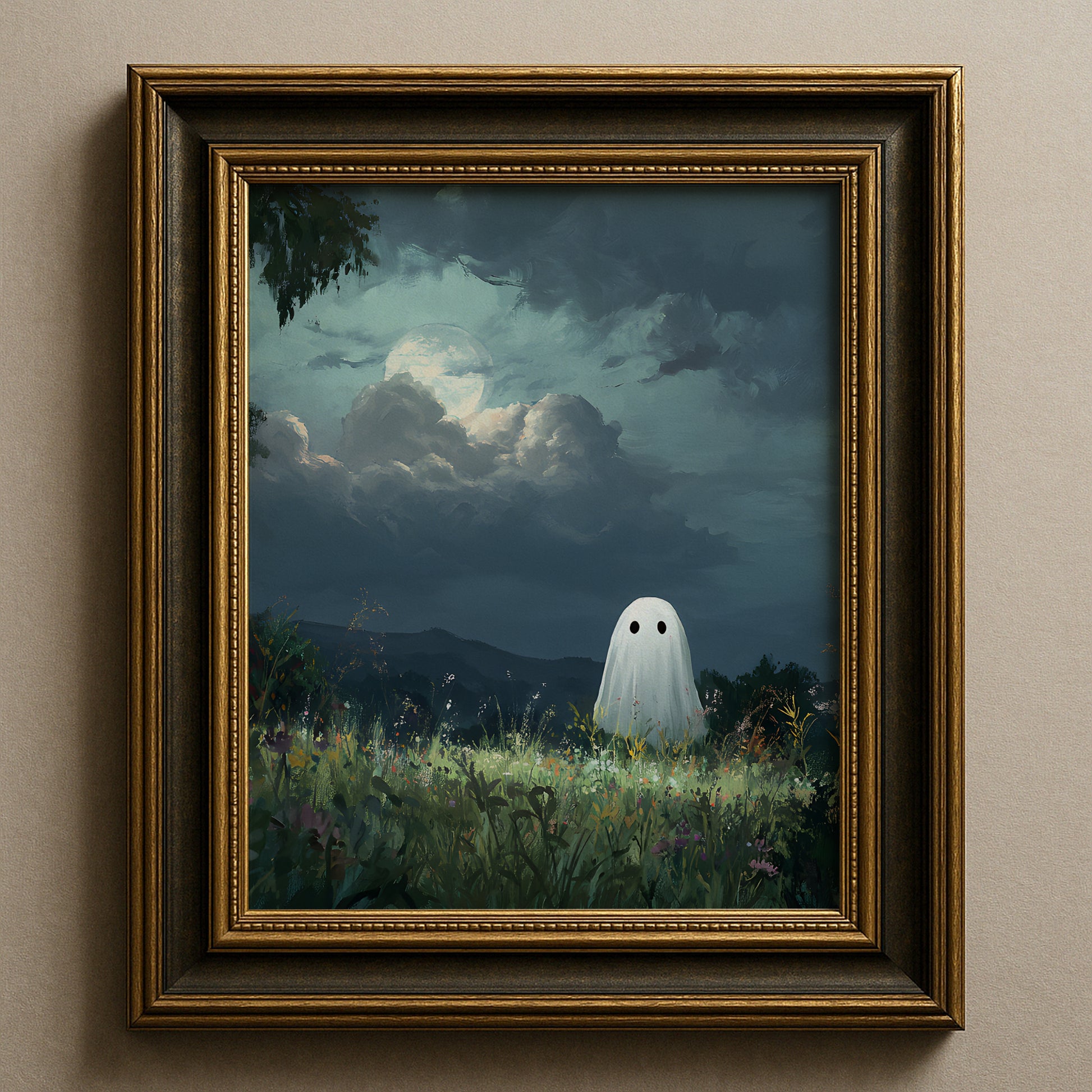 Haunted Ghost in Meadow Forest Poster, Eerie Ghost Spooky Night Print, Home Decor Wall Art, Unframed