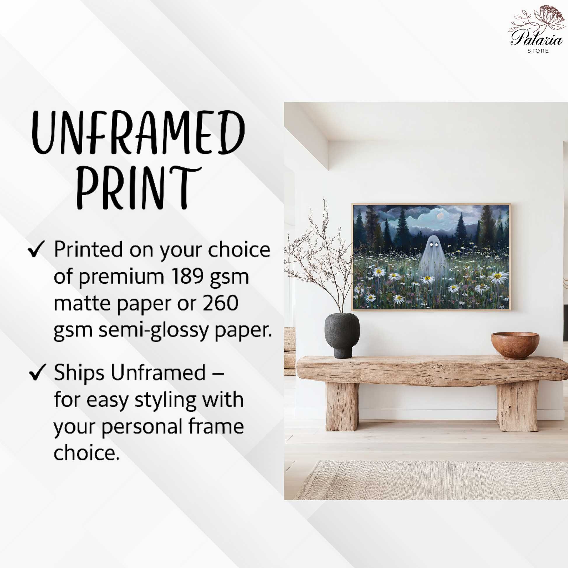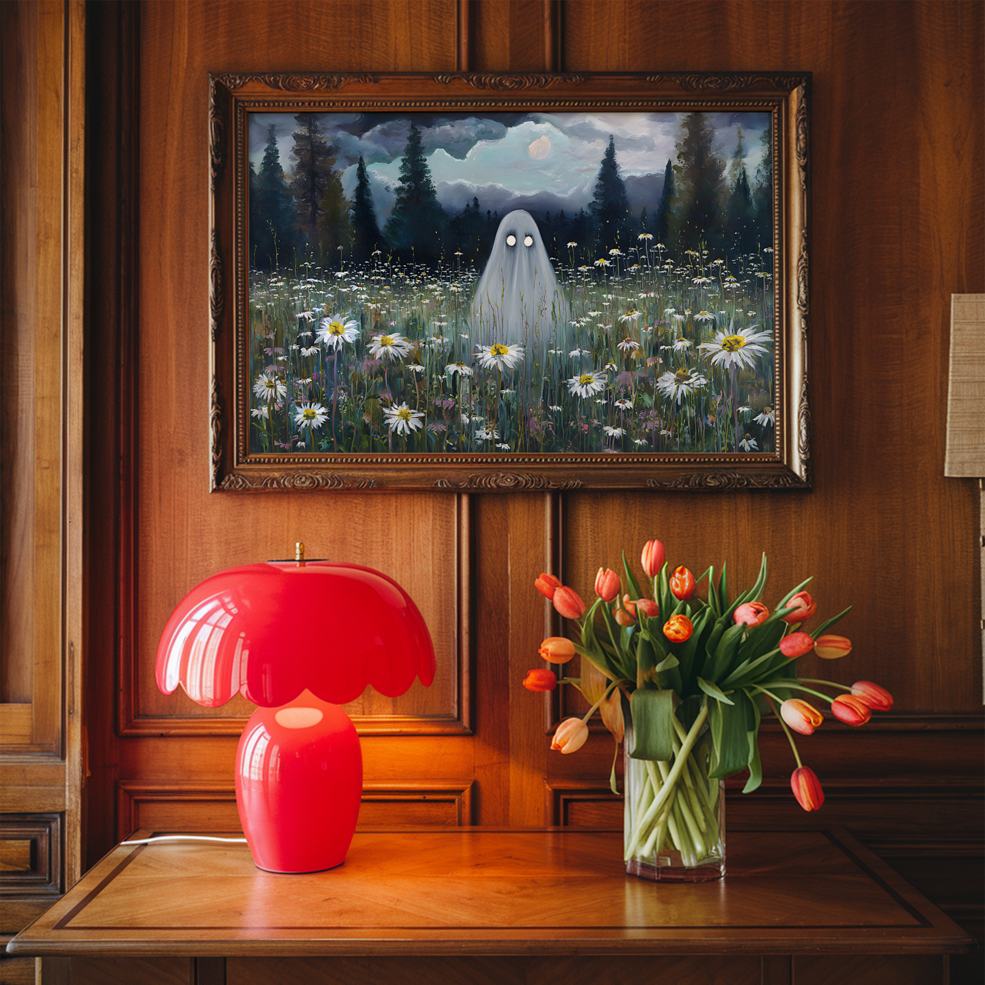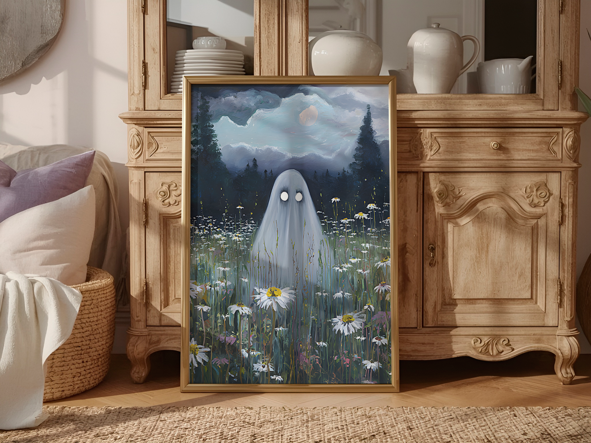 Haunted Ghost in Meadow Poster, Spooky Eerie Ghost Moonlit Wildflower Field Wall Art Print