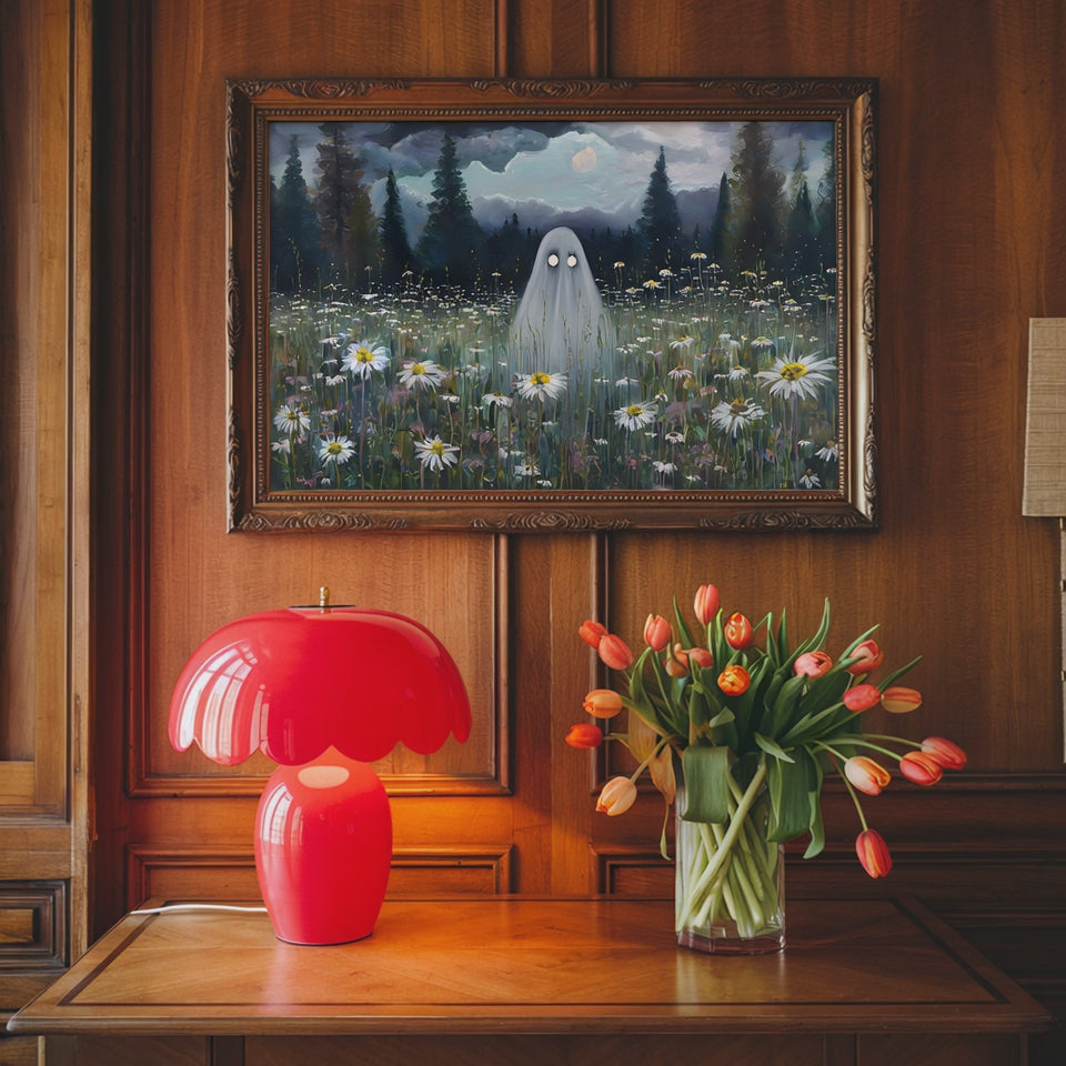 Haunted Ghost in Wildflower Field Poster, Spooky Ghost Print, Ghost in Moonlit Meadow Wall Art