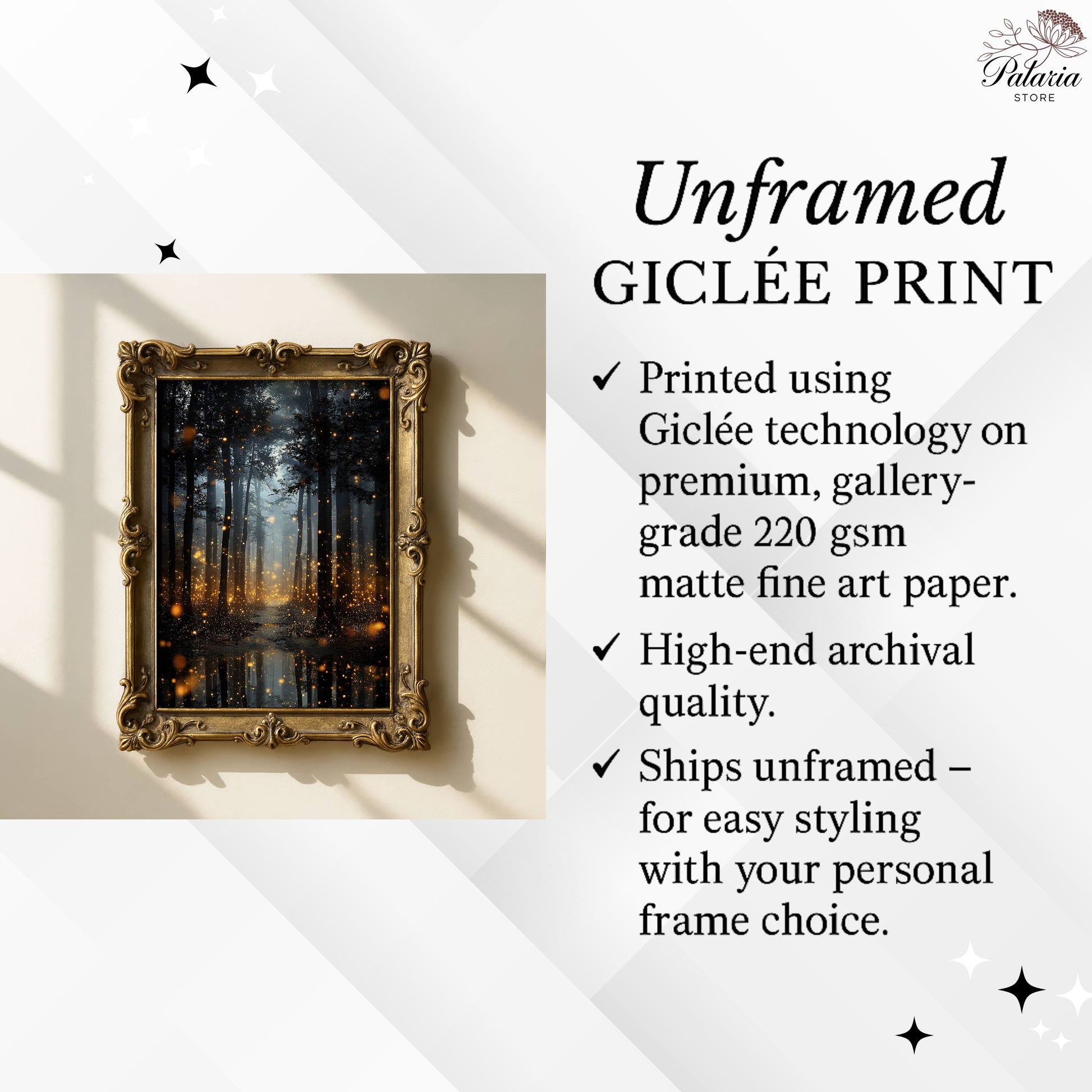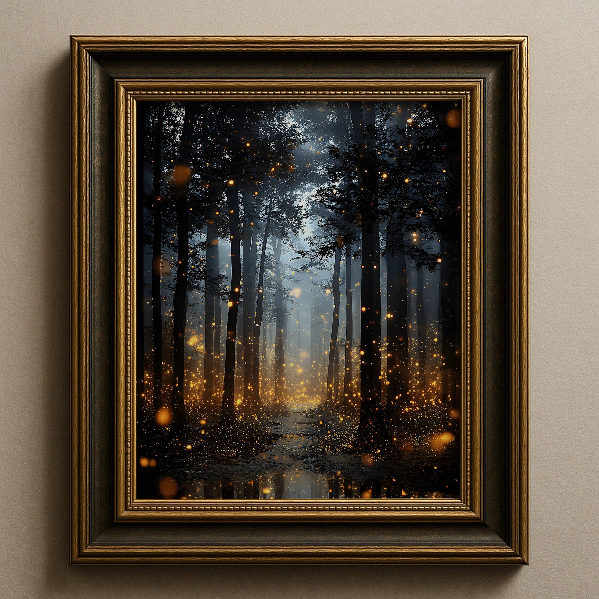 Enchanted Fireflies Forest Fine Art Poster, Magical Golden Glow Woodland Path Print, Mystical Nature Firefly Wall Art, Unframed