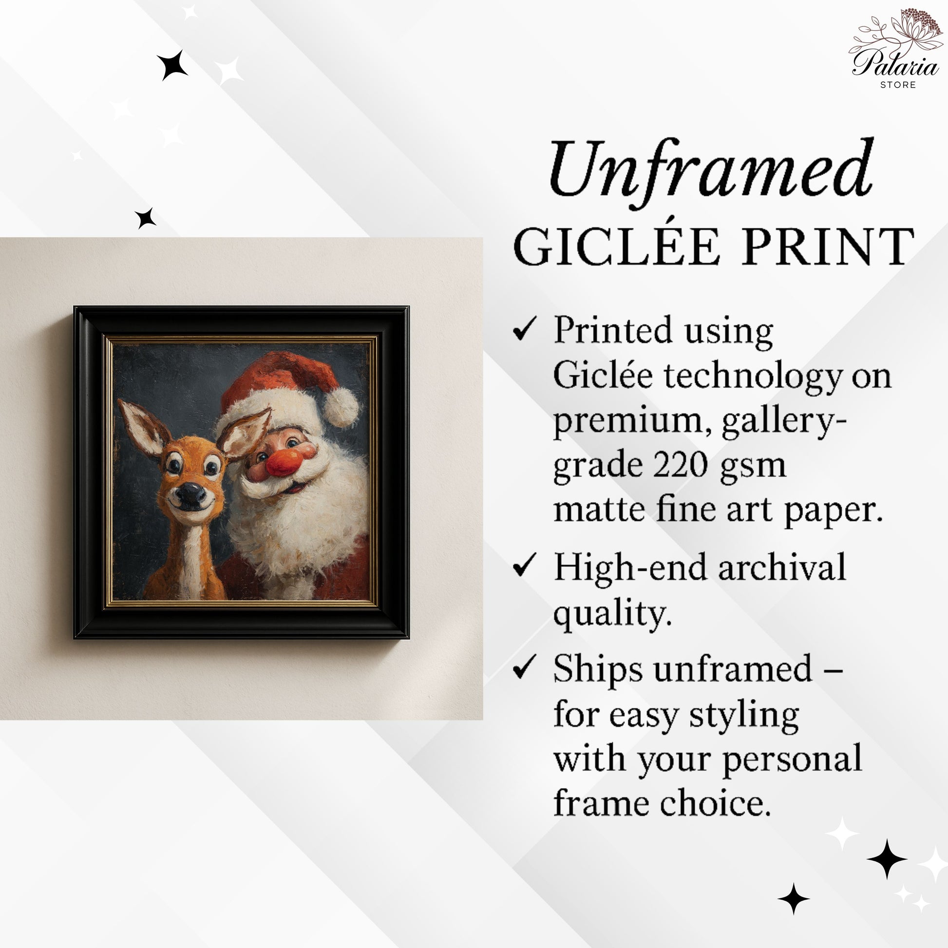 Retro Santa and Reindeer Christmas Poster, Vintage Holiday Print with Cheerful Seasonal Charm, Nostalgic Christmas Wall Art, Unframed