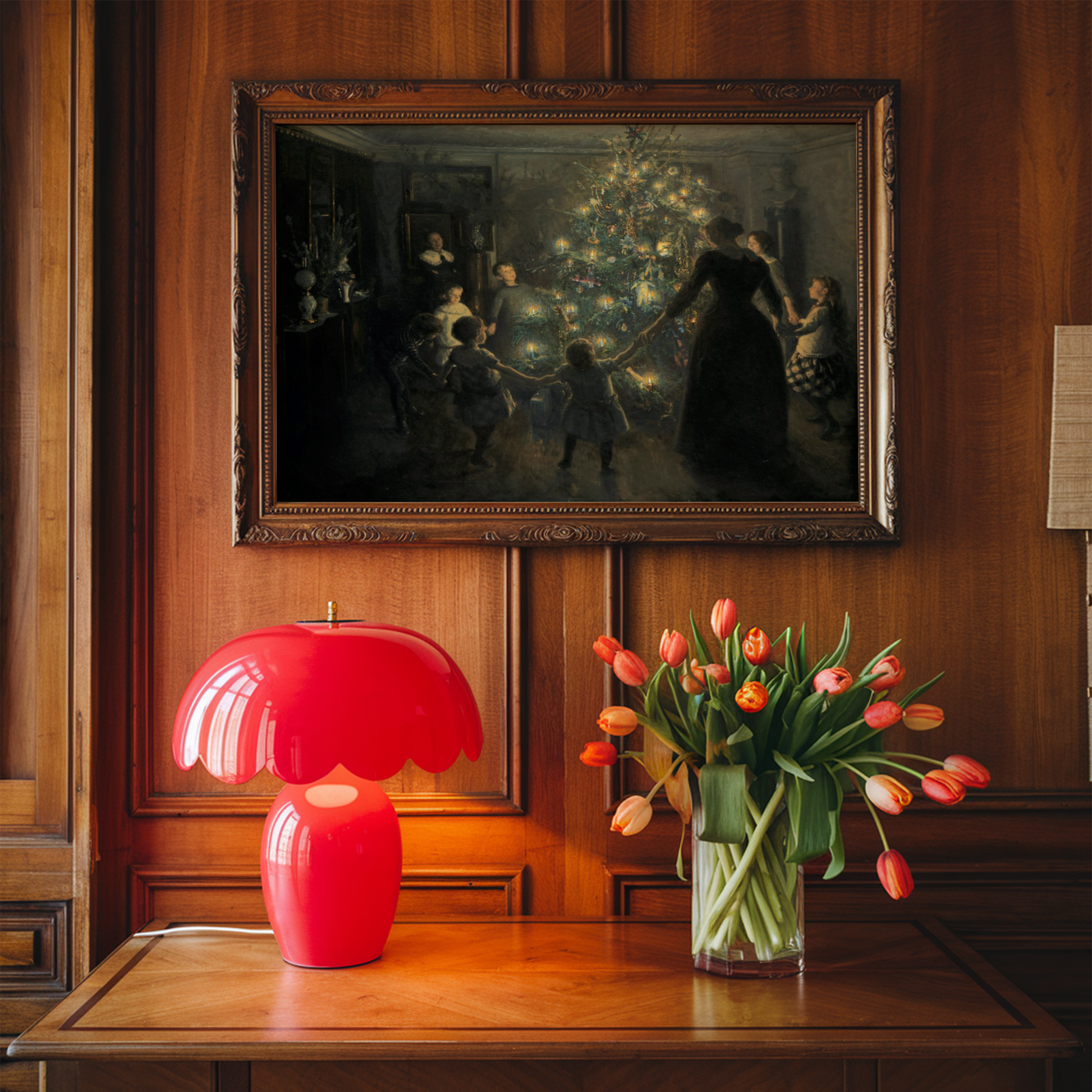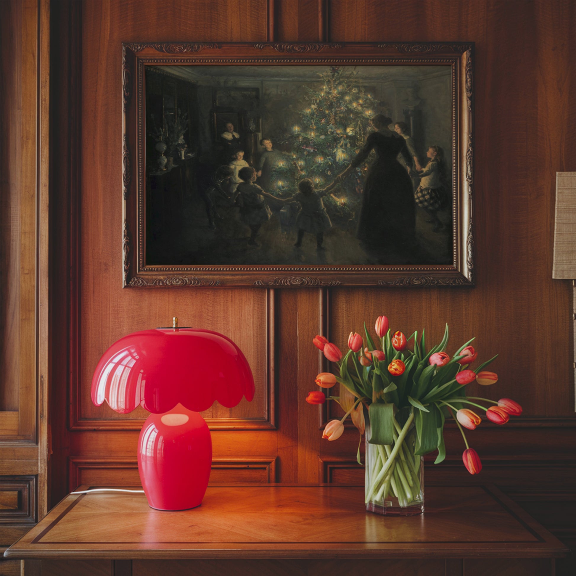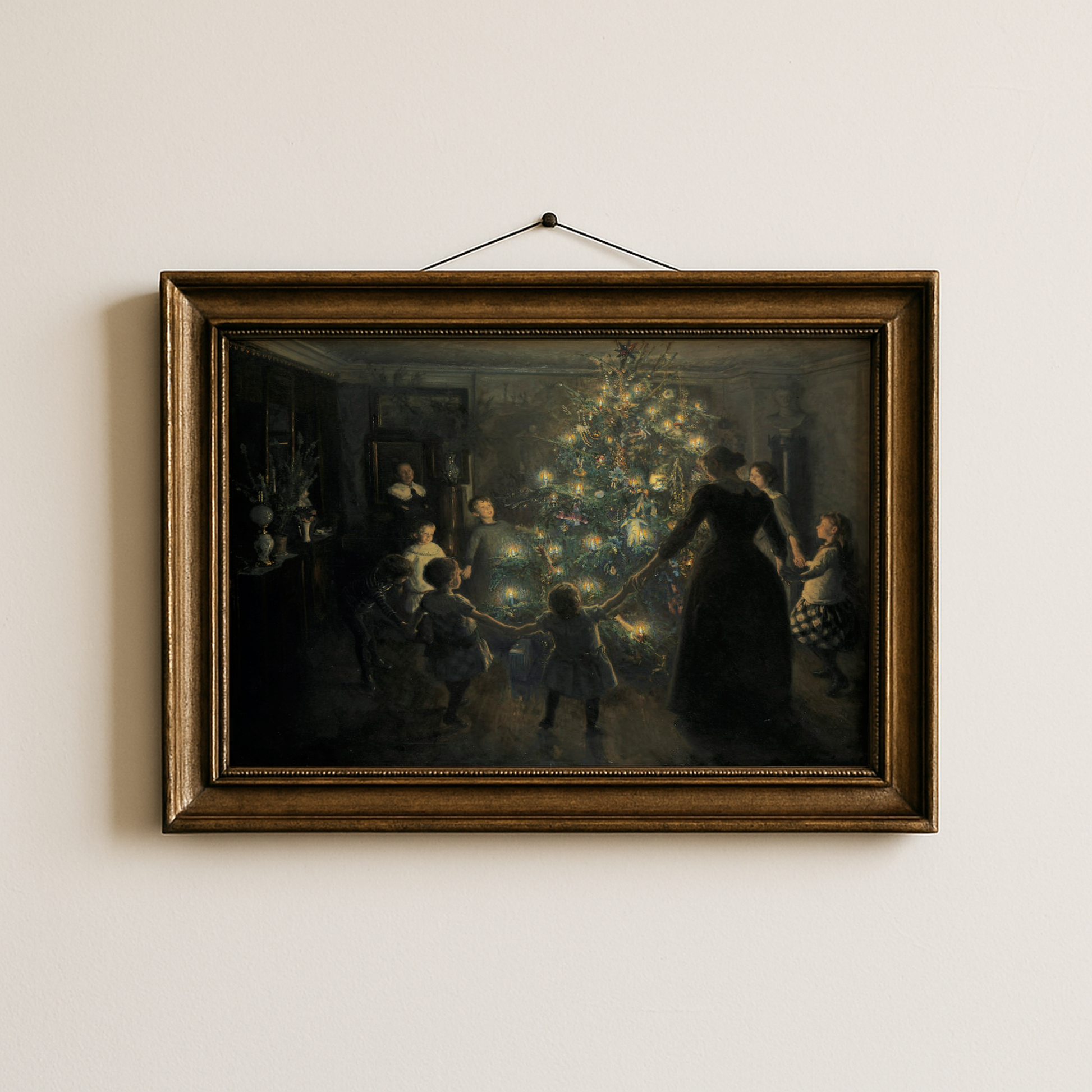 Vintage Family Around Christmas Tree Fine Art Poster, Victorian Christmas Eve Winter Print, Soft Glowing Christmas Lights Holiday Wall Art, Unframed
