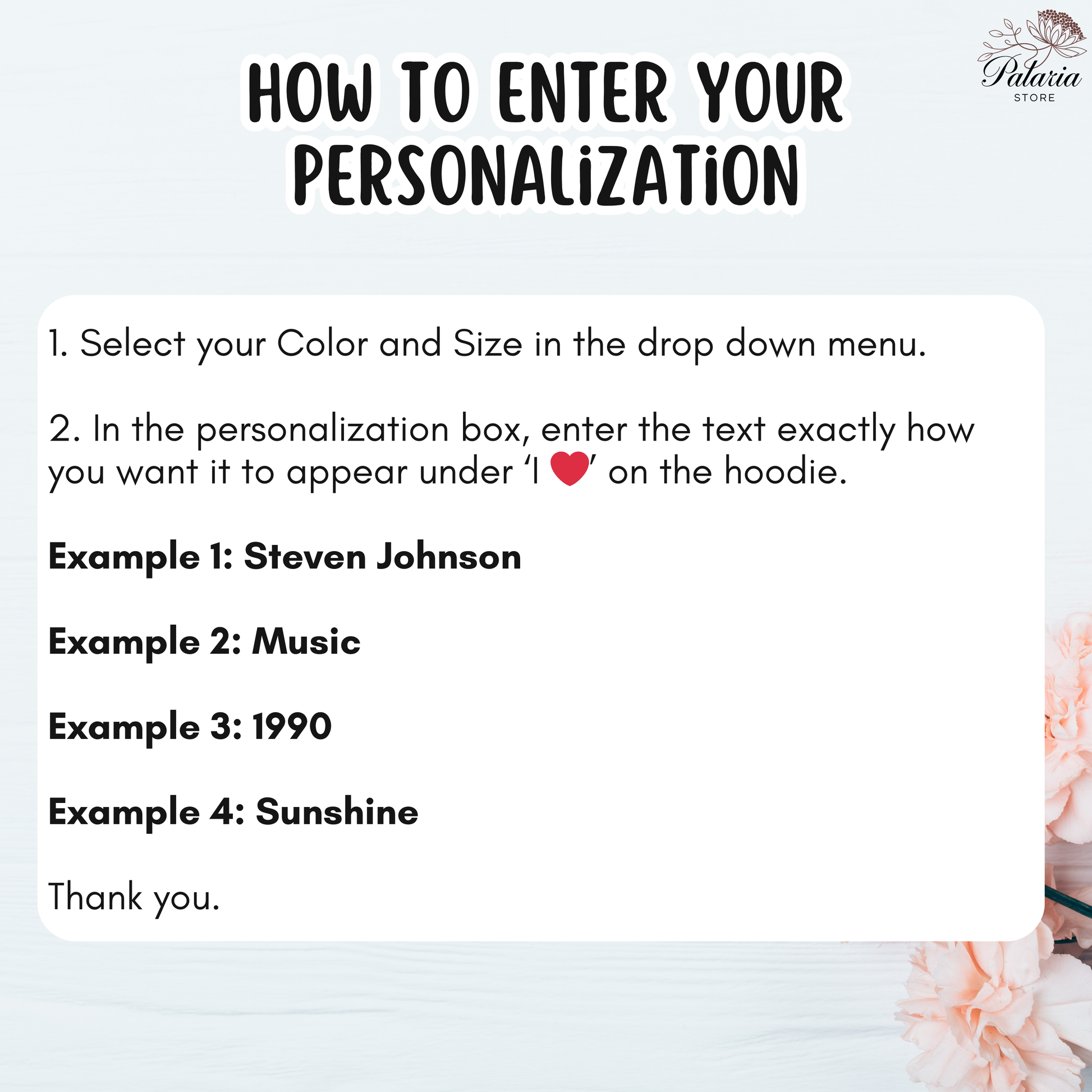 2. You will see personalization options above. Please select your hoodie size and color (Sizes and colors are shown on the listing photos).